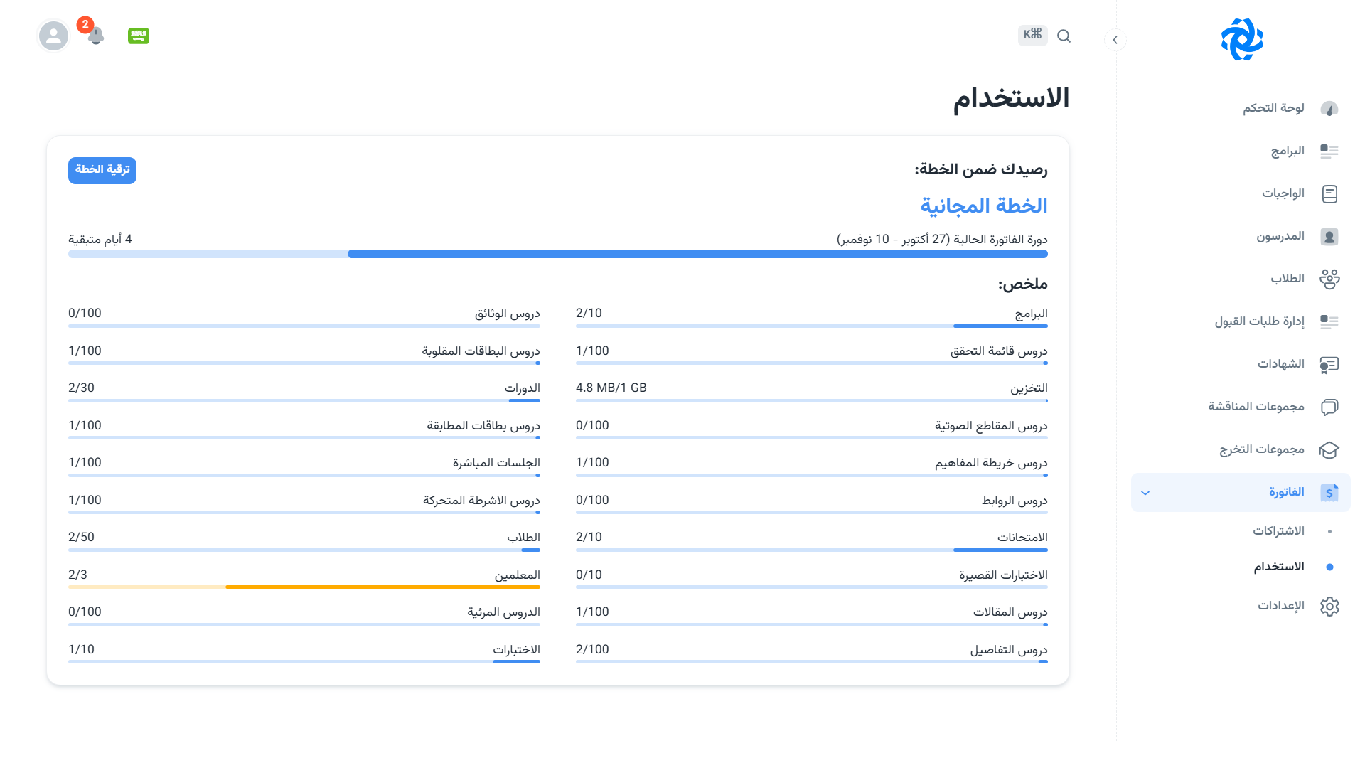 إدارة المنصة إدارة الفاتورة إدارة الاشتراكات من خلال اتباع الخطوات التالية يمكنك الاشتراك بالخطة المناسبة لك إدارة الاستخدام تظهر هذه الصفحة رصيدك ضمن الخطة الحالية ويمكنك ترقية الخطة من خلال النقر على أيقونة ( ترقية الخطة ) السابق التالي
