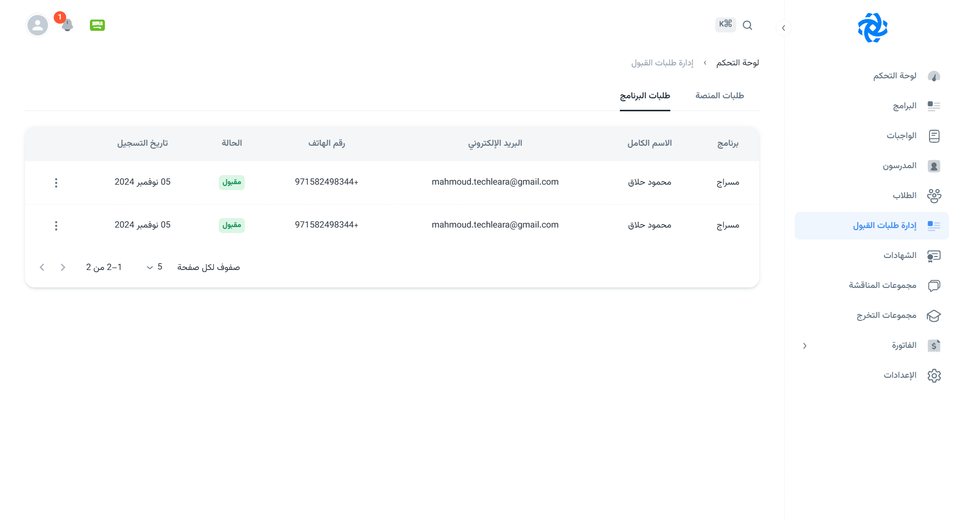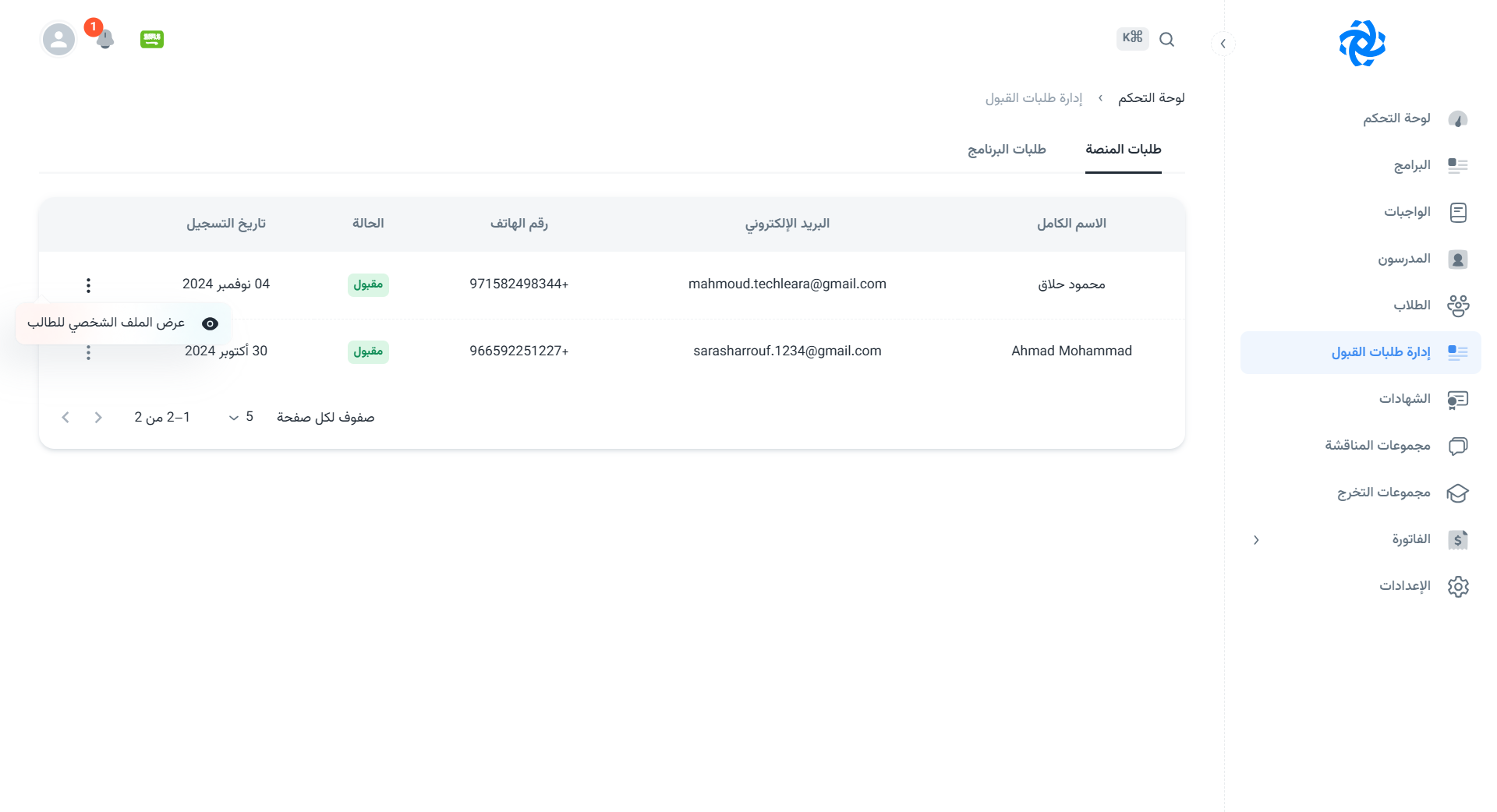 "تحتوي هذه الصفحة على جميع طلبات انضمام الطلاب للبرنامج ، وتعرض البيانات التالية لكل طلب: