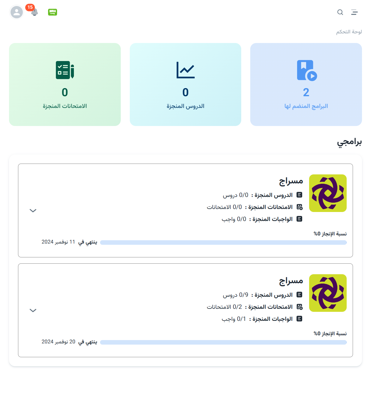الطلاب لوحة التحكم لوحة التحكم:تقدم لوحة التحكم معلومات أساسية تخص الطالب، تشمل:عدد البرامج التي انضم إليهاعدد الدروس التي أتمهاعدد الامتحانات التي اجتازهابرامجي:تعرض هذه القسم تفاصيل ومعلومات حول البرامج التي انضم إليها الطالب. السابق التالي